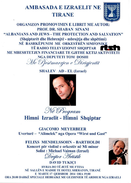 Me 17 Qershor 2014 ora 19:00 tek hotel Sheraton, Ambasada e Israelit ne Shqiperi organizon promovimin e librit me autor: Prof. Dr. Shaban SINANI “Albanians and Jews – The Protection and Salvation” (Shqiptaret dhe Hebrenjte – Mbrojtja dhe Shpetimi). Ne bashkepunim me orkestren simfonike te Radio Televizonit Shqiptar edhe me mbeshtetje financiare te deputetit Tom Doshi dhe me pjesmarjen e dirigjentit Izraelit Shalev Ad-El. Ne oren 20:00 nje darke hebraike me gatime nga kuzhinier te ardhur nga Izraeli.
